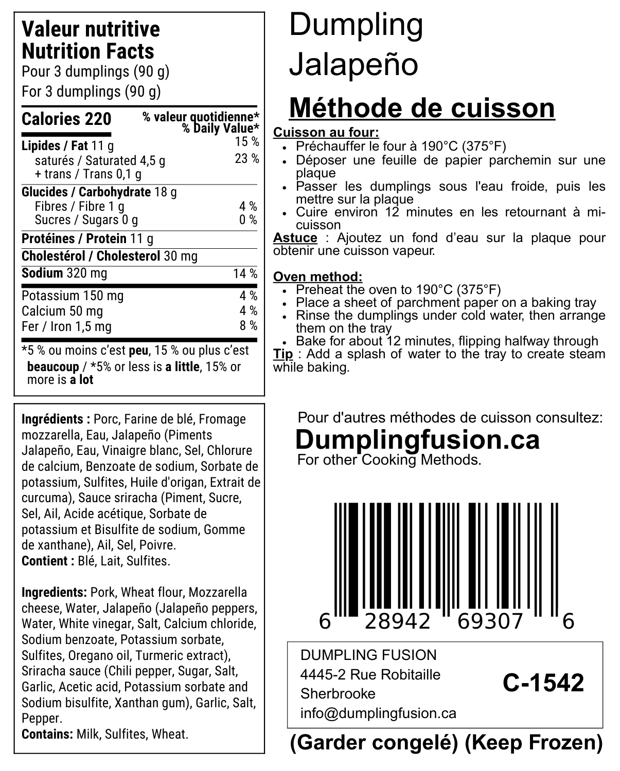 Ingrédients : Porc, Farine de blé, Fromage mozzarella, Eau, Jalapeño (Piments Jalapeño, Eau, Vinaigre blanc, Sel, Chlorure de calcium, Benzoate de sodium, Sorbate de potassium, Sulfites, Huile d'origan, Extrait de curcuma), Sauce sriracha (Piment, Sucre, Sel, Ail, Acide acétique, Sorbate de potassium et Bisulfite de sodium, Gomme de xanthane), Ail, Sel, Poivre.